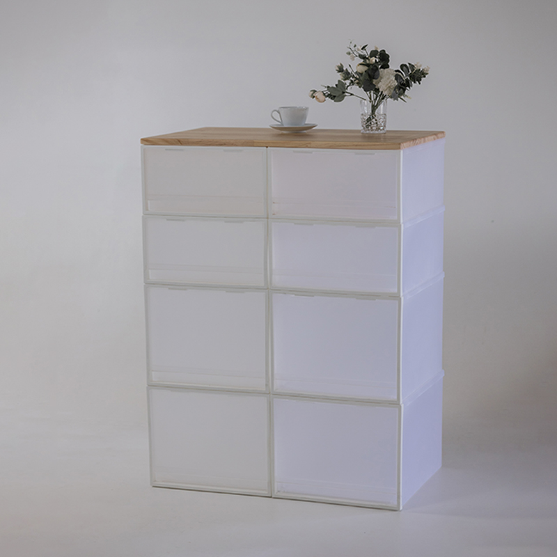 以可堆疊的收納結構搭配原木桌板,於柔霧般的透明之上,添上一抹木色的溫度。